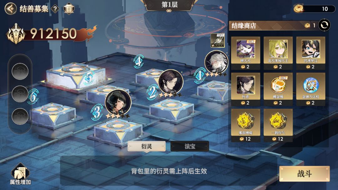 每次开始前,玩家需要选择初始队伍,每支初始队伍分别包含当期新增灵宝及对应衍灵(队长)。选定队伍后,将逐层深入挑战,挑战过程中,将获得专用货币“善缘宝贯”,可用于在结缘商店中购置法宝、符咒、衍灵,来提升战力并优化阵容搭配,购买重复的衍灵或法宝时,将自动提升对应衍灵或法宝的星级。
