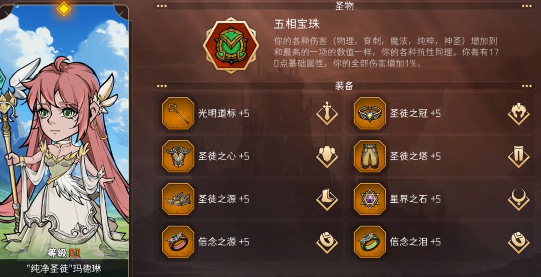 神圣牧首:武器选择群体治疗的专属武器【光明道标】,套装选择 【圣徒套装】,项链用【星界之石】保证回能,戒指选择牧师专属的【冷却剂】和【减耗戒】。所有攻击向的装备词条尽量都选【命中】【暴击】【全部伤害】,所有防御向的装备词条都选【韧性】【闪避】【全部抗性】。圣物选择【群山之祝】来加属性,如果你有某个抗性特别高,可以考虑用【五相宝珠】。项链上的赛季词条选择【鼓舞】,戒指上的赛季词条选择【能量守恒】和【能量上限】。