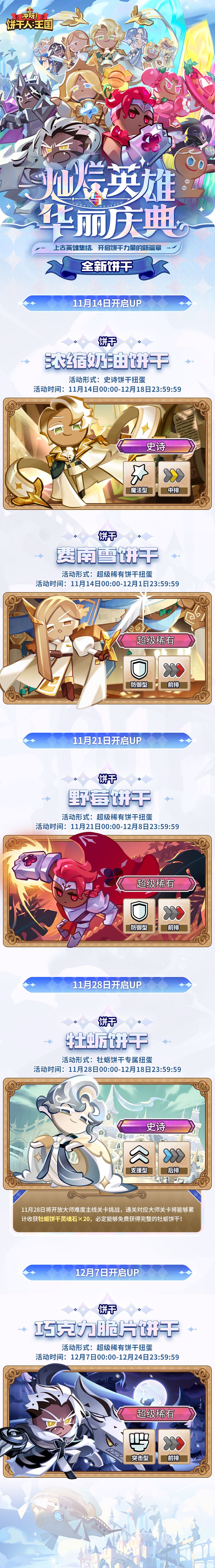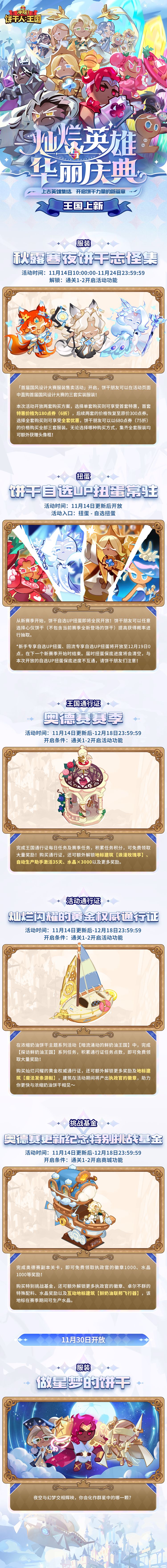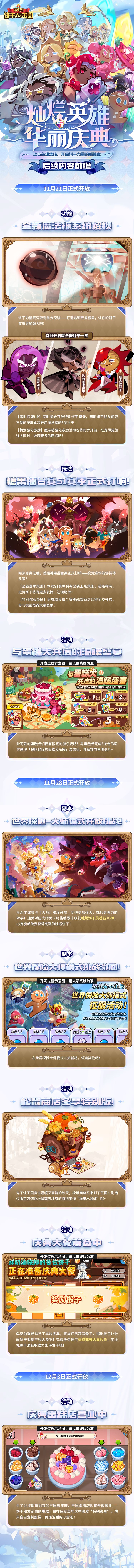 饼干人王国全新版本将于11月14日开启:全新特殊区域篇章「饼干奥德赛」开放,全新魔法型「史诗」浓缩奶油饼干、支援型「史诗」牡蛎饼干,「超级稀有」费南雪饼干、野莓饼干、巧克力脆片饼干将陆续实装,更有唤醒饼干强大力量的「魔法糖」即将诞生——英雄群起,见证浩瀚史诗篇章的新页!