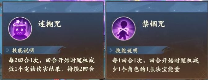魔咒2:迷糊咒,每2回合1次,回合开始随机减低1个宠物伤害结果,持续2回合