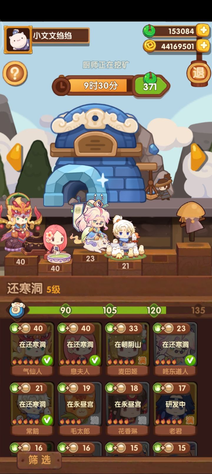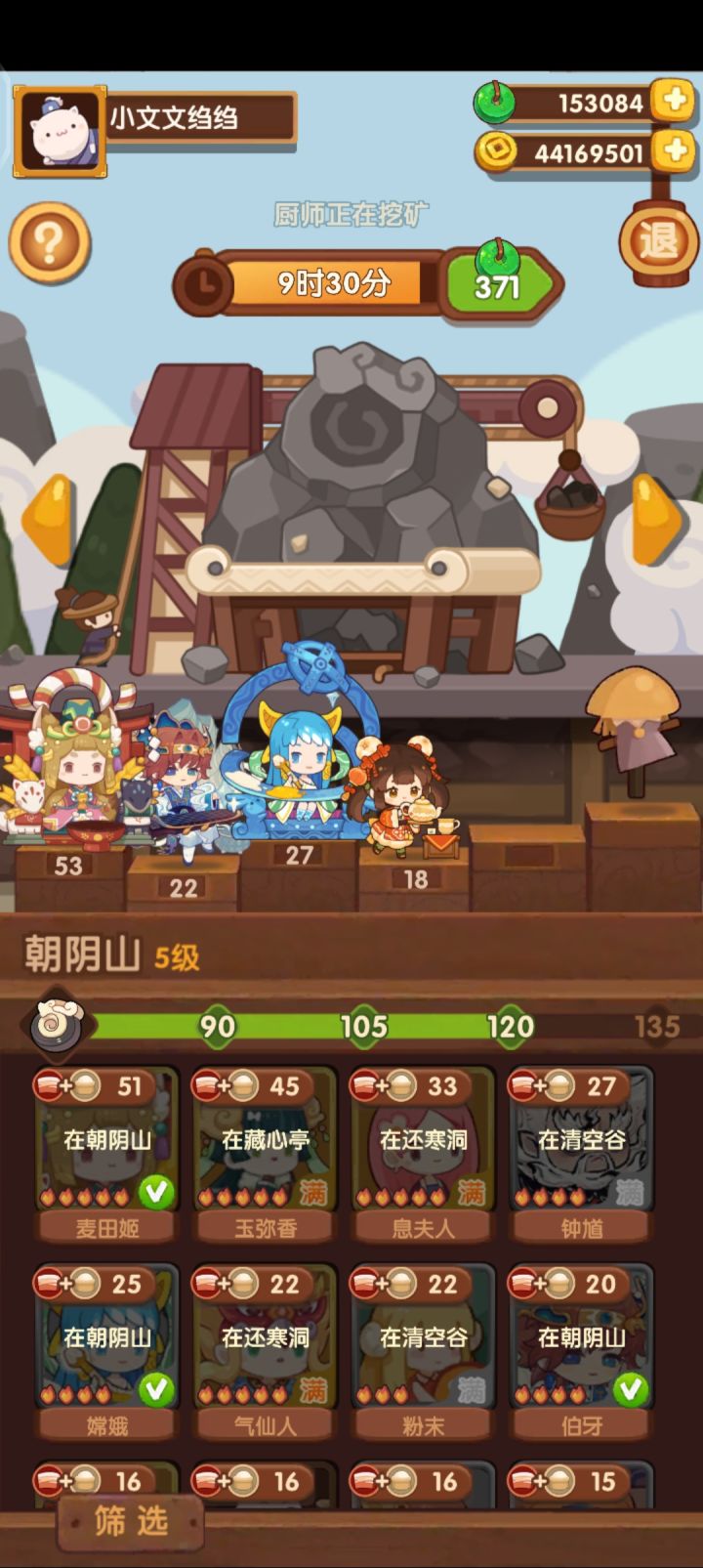 1.朝阴山已经120点,已经毕业,后续如果有三火采集遗玉,可以给伯牙和嫦娥装备,桂小乌现在用的席丰玉,如果以后宴会上阵机会少了,可以装采集遗玉