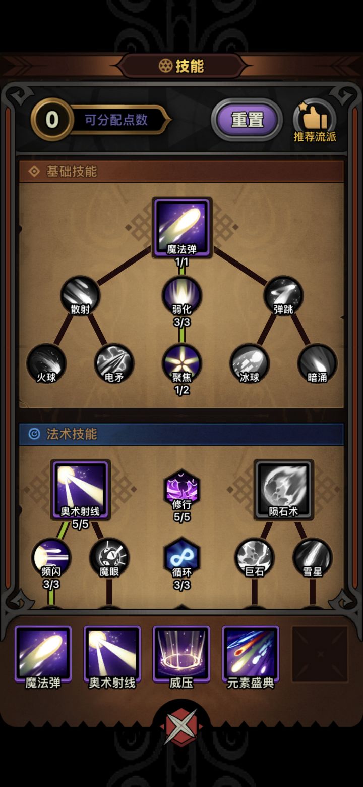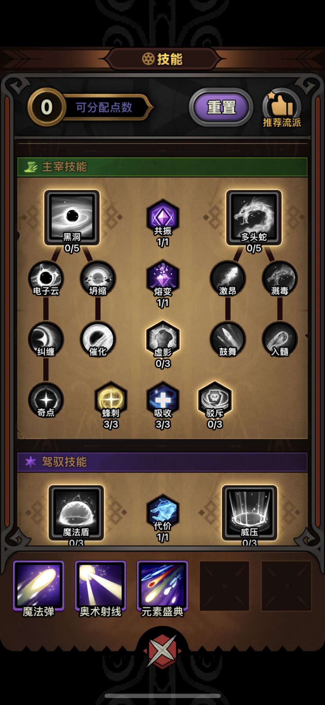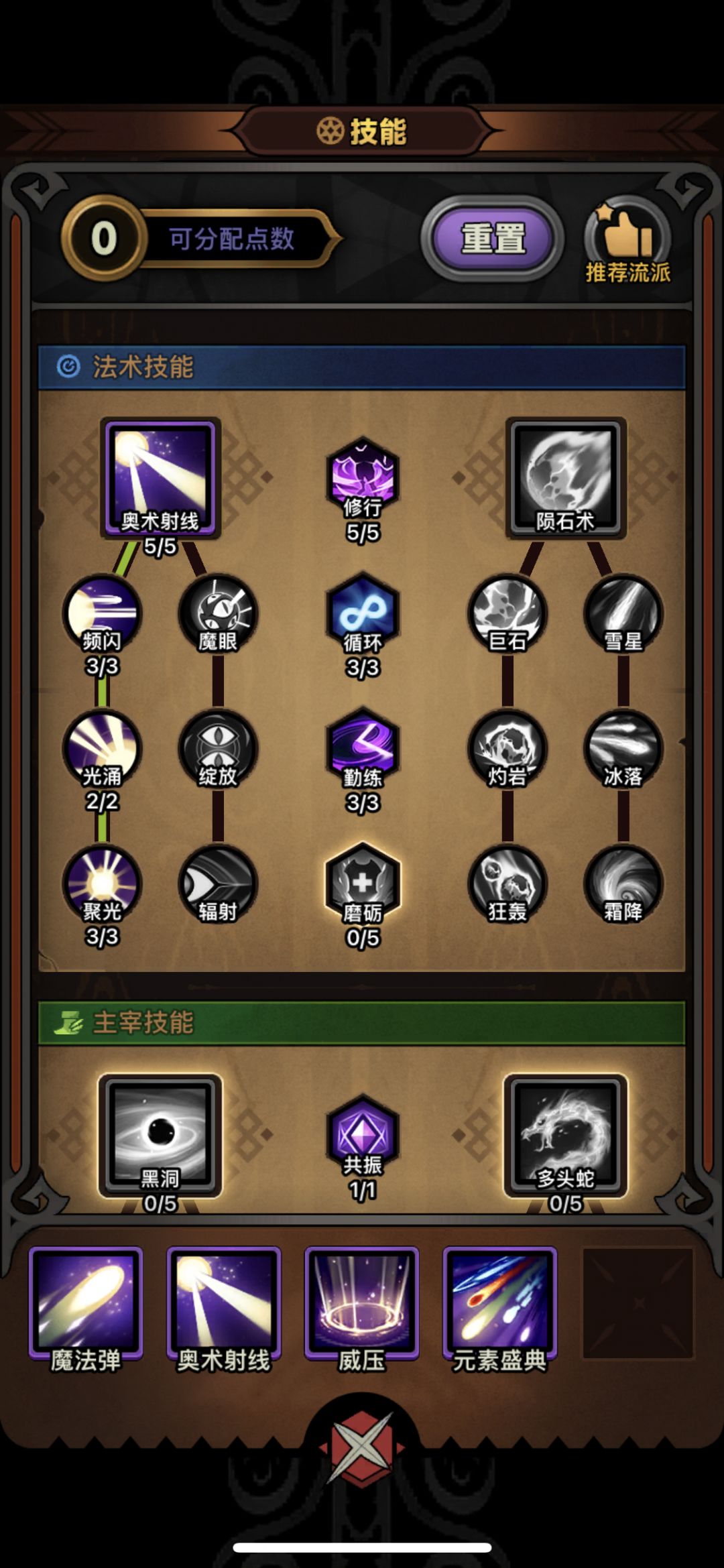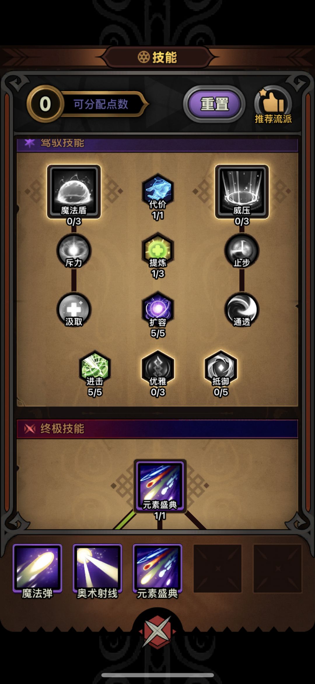 技能选择:点了代价,用杀怪回能跟捡血包回能保证能量。基本够用。舍弃了魔法盾。不过只要保证能量够就行。11.7更新:把每3秒回能取消,杀怪回能只点两级,腾出4点技能点出威压。