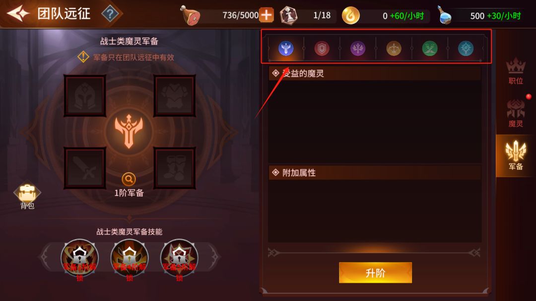 点击“军备”按钮将进入军备系统,可进行军备合成、穿戴、升阶操作;军备系统内将魔灵分为战士、坦克、辅助、游侠、刺客、法师六种类型,每一种类型对应一套军备,玩家可根据上阵魔灵的情况,选择性的提升军备。