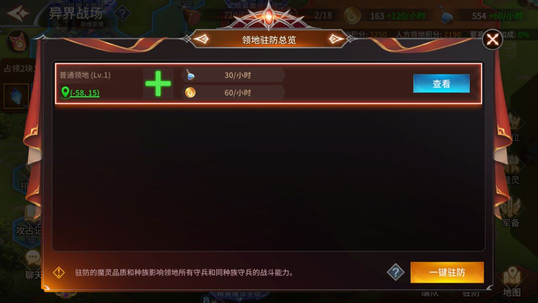 2、点击右下角“驻防”按钮即可查看到所有已占领的领地,选择需要驻防的领地进行驻防,或是点击“一键驻防”即可完成驻防;