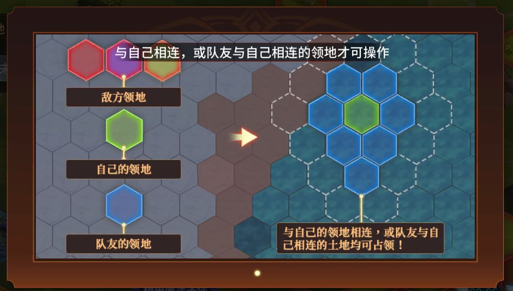 在攻打领地的过程中,仅可攻打与自己基地或领地(格子)接壤,以及自己领地(格子)连接队友基地或领地(格子)后,队友基地或领地(格子)旁的领地(格子)。