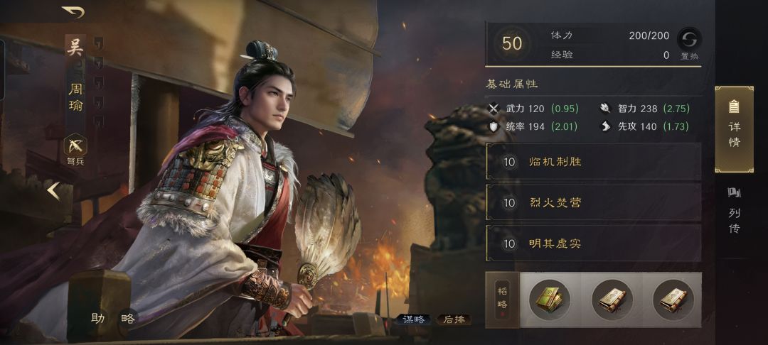 再看小乔的情况,天香发动率累积达到78%。周瑜身负的烈火焚营和明其虚实,发动率被提升到了59%,全队总共能对敌施加火攻、虚弱、混乱三种异常状态,足够临机制胜发挥了。