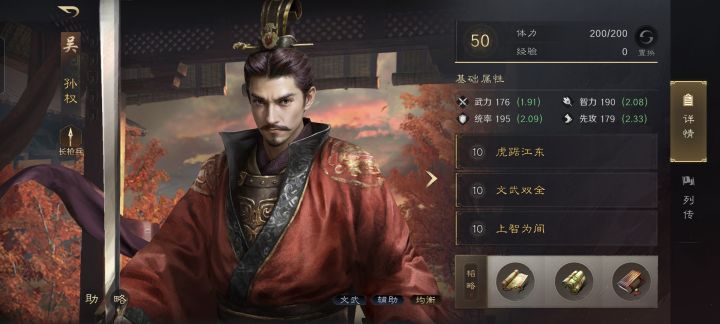 雁形阵前排的是孙权和小乔,后排是周瑜。由于虎踞江东的加持效果,孙权自身的文武双全和上智为间,加上兵书效果,发动率被提升到了82%和62%。