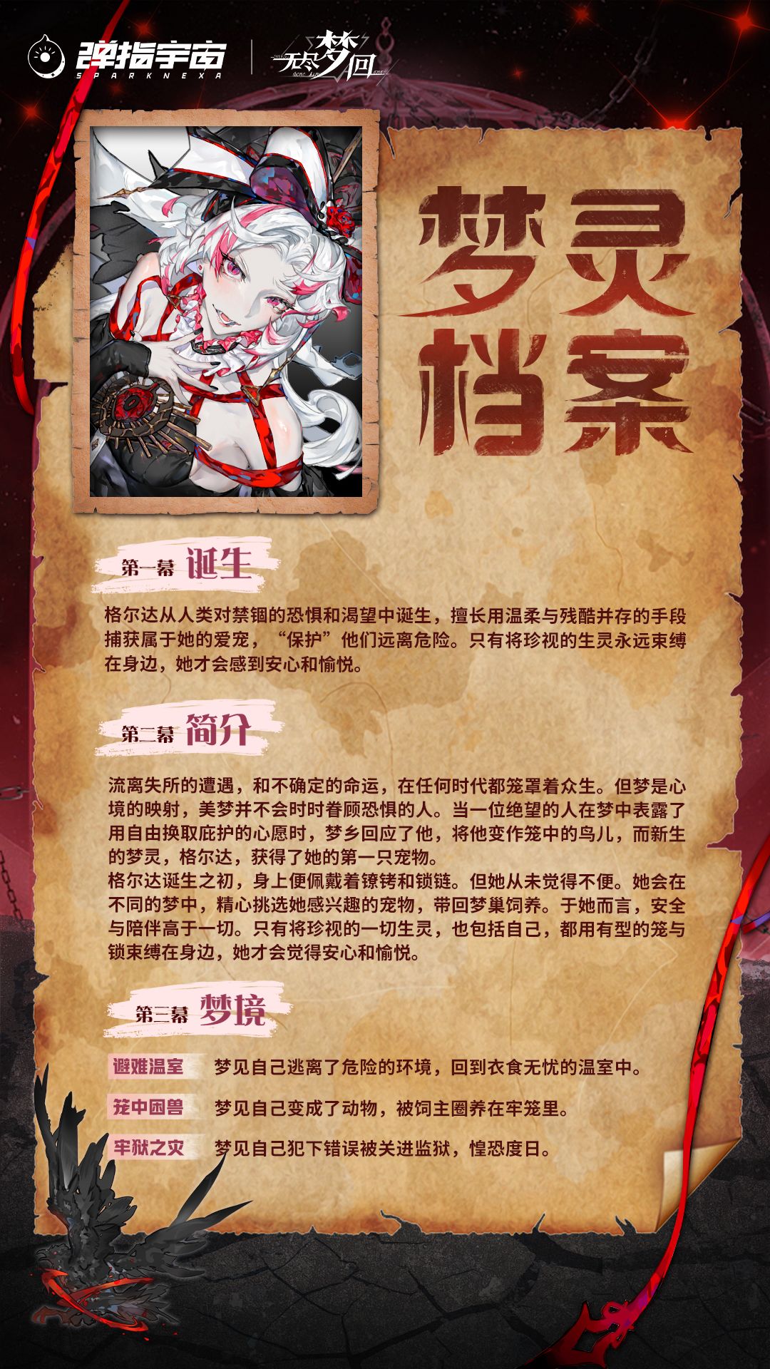 ♾️流离失所的遭遇,和不确定的命运,在任何时代都笼罩着众生。但梦是心境的映射,美梦并不会时时眷顾恐惧的人。当一位绝望的人在梦中表露了用自由换取庇护的心愿时,梦乡回应了他,将他变作笼中的鸟儿,而新生的梦灵,格尔达,获得了她的第一只宠物。