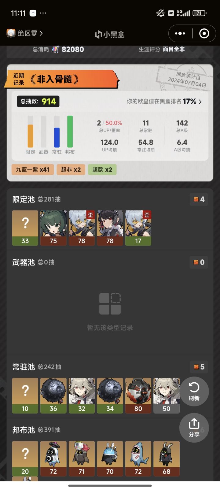 从开始到现在只抽了两个角色打防卫战,屯了315抽了。