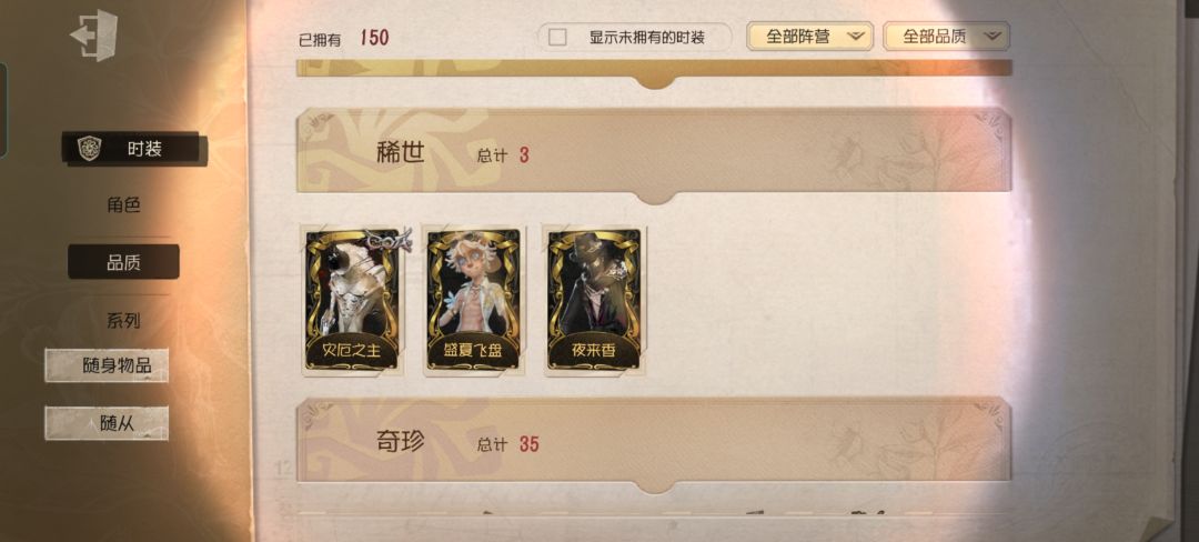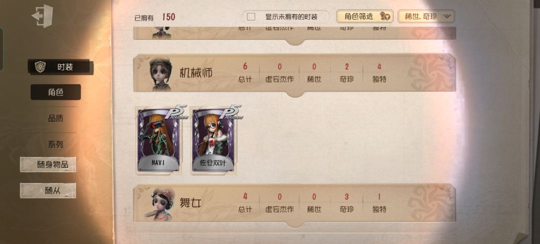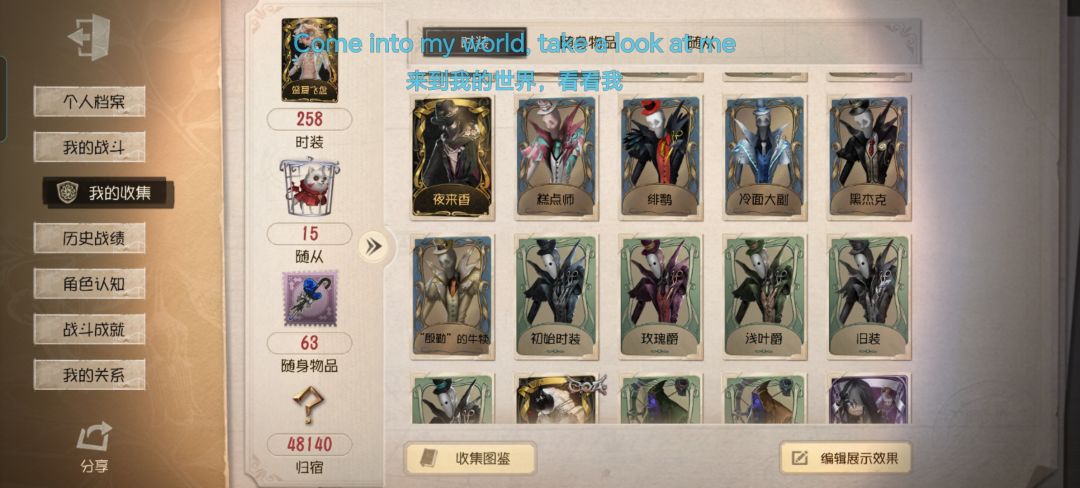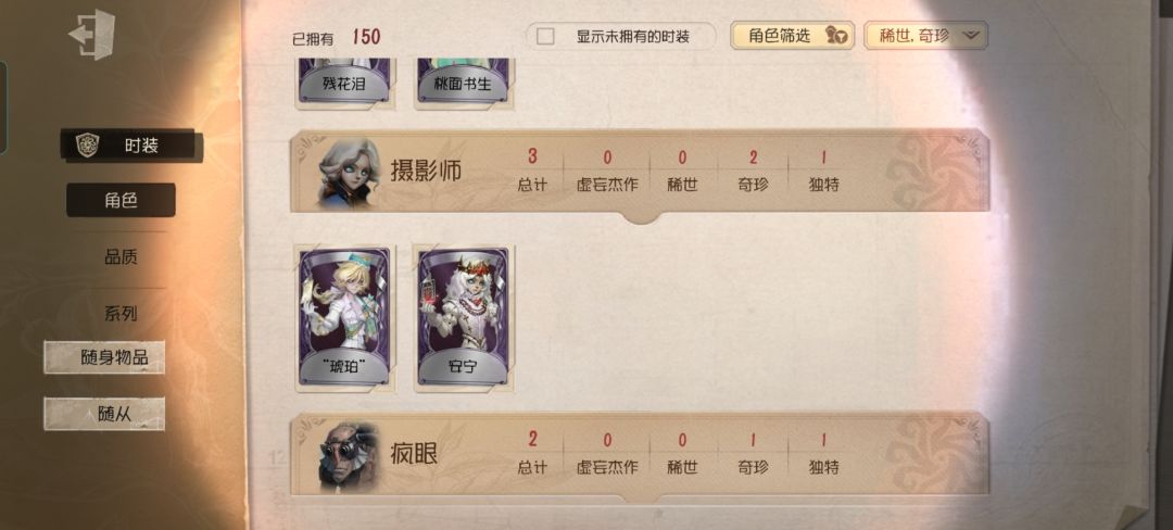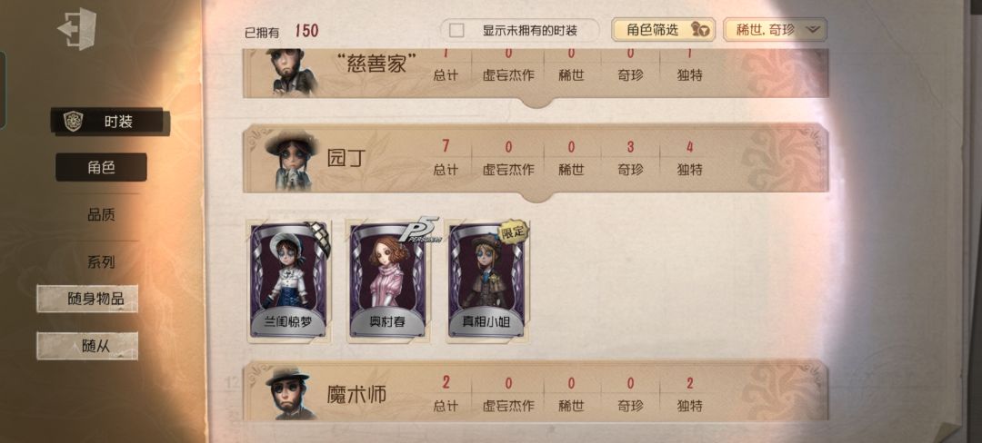例如:园丁玩家(一个真相小姐完全够玩好久了,手感真的很nice),杰克玩家(夜来香➕蓝玫瑰手杖,谁不心动?),医生,邮差,约瑟夫,黄衣之主,勘探员,机械师,律师,牛仔,红蝶,舞女,医生一系列皮肤感觉很好看的