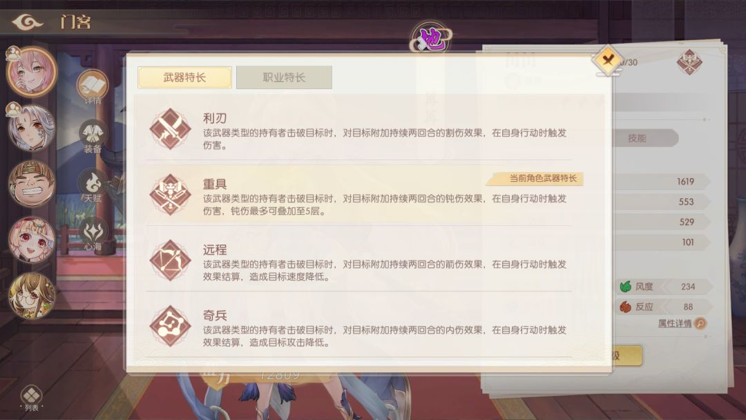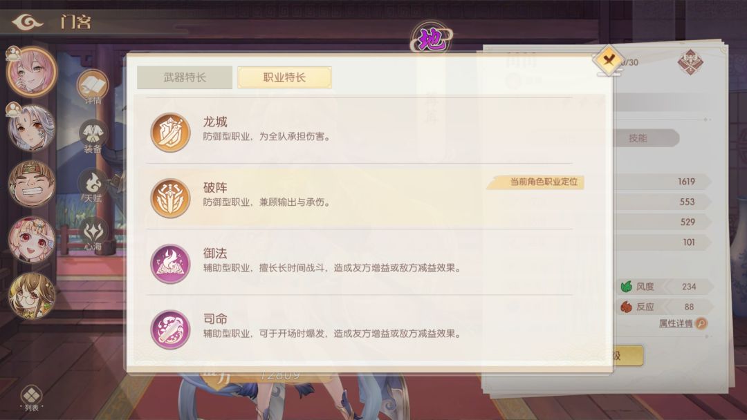 角色从品质上分为【地】和【天】两种品质,职业分为急羽、暗刑、龙城、破阵、御法和司命,武器上分为利刃、重具、远程和奇兵!