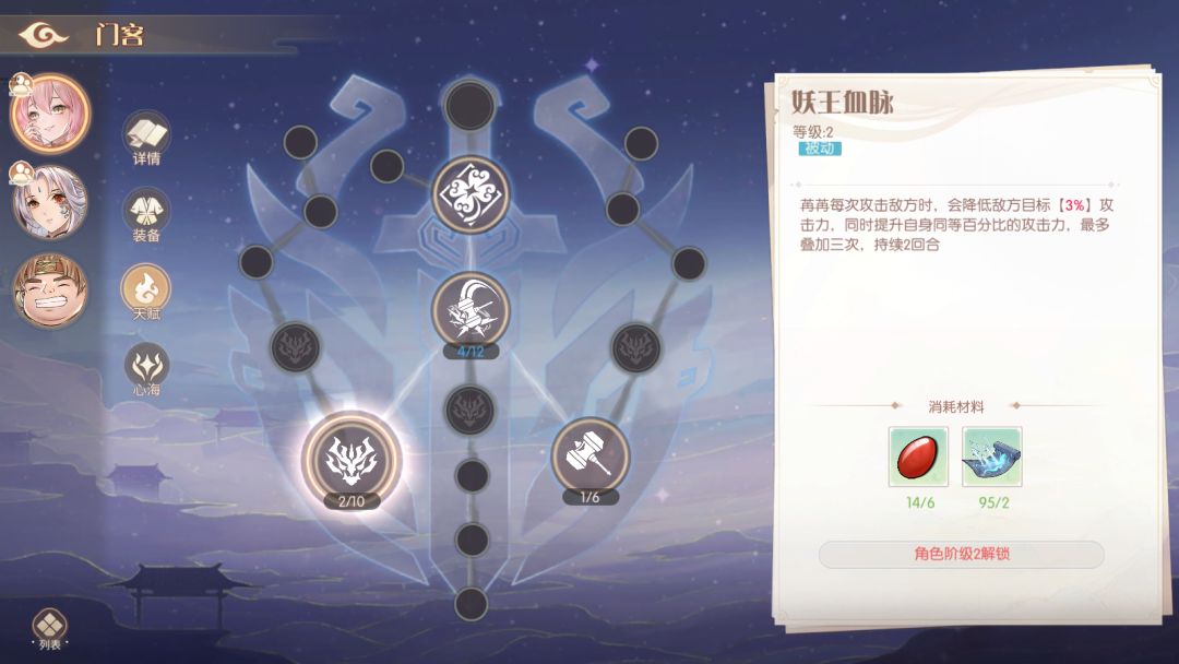 每个角色总共18条天赋,都与角色经历有关,通过消耗指定道具提升,同时与角色本身的等级、阶段挂钩,以及前置的天赋是否解锁!不同的职业拥有不同的升级路线,等待阁主前去探索!