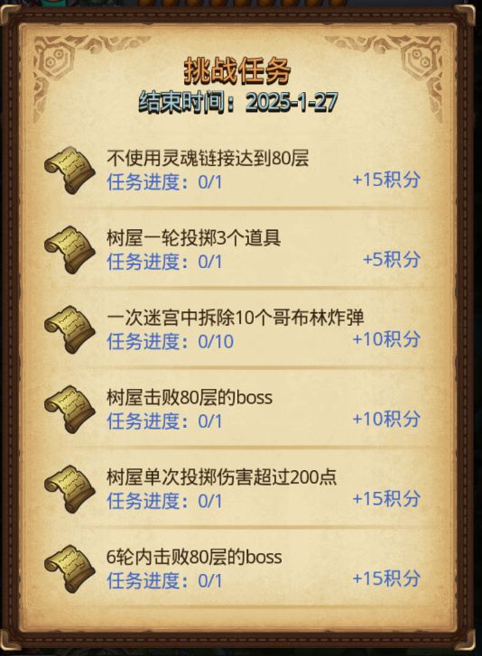 可挑战6轮内击败80层的boss等15积分任务