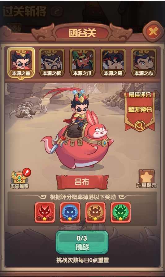 函谷关分为5个关卡boss,分别对应本源武技的5个部位产出,同样随武将转生等级进行解锁、关卡每日可免费挑战3次,消耗完后还可花费元宝购买一定的次数,想快速养成本源武技的主公建议每日清空所有次数。