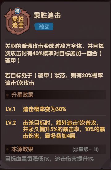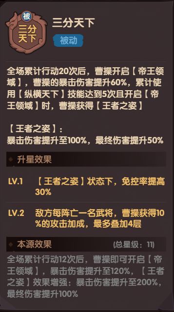 2.周瑜、曹操,孙策等主C特定星级本源效果能对武将能力发挥产生质变作用的,推荐所有部位平均升级。如曹操60星本源效果除技能伤害数值提升外,还大幅缩减了帝王领域的触发所需行动次数,使的曹操的爆发更加频繁,输出获得极大的提升,因此平均升级所有部位快速到合计60星才是最佳选择。