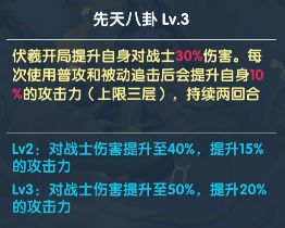 Lv3:伏羲造成所有伤害增加16%,对生命值高于64%的前排单位造成伤害增加至64%。