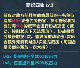 普攻对敌方前排生命值最低的一名单位造成160%攻击力的伤害,友军普攻和技能时有50%的概率会进行协战攻击(被动,控制状态下无法释放),协战每回合最多触发4次。普攻或被动攻击4次后会额外无消耗触发1次圣龙威压(每回合至多额外释放一次大招)。