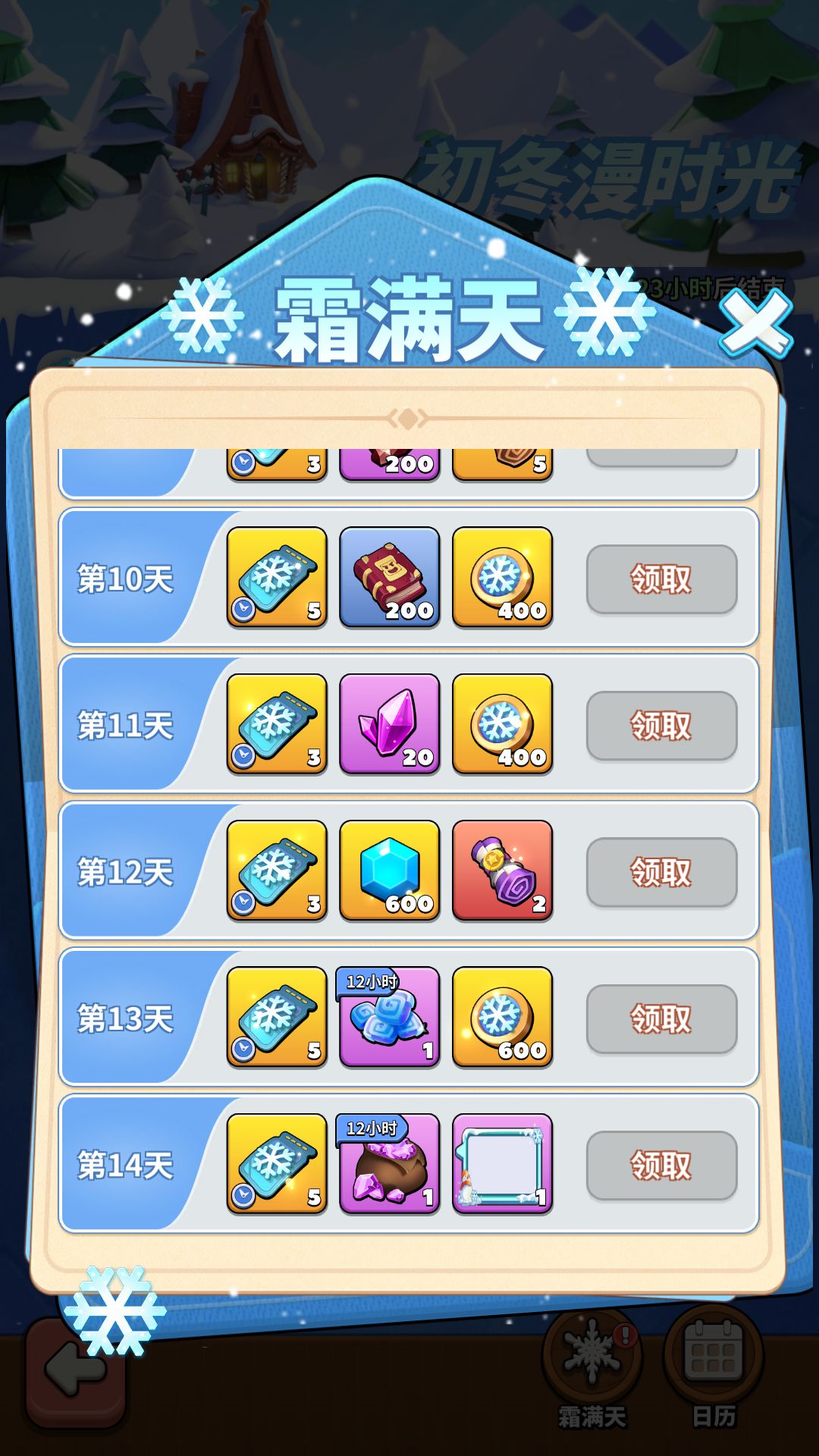 活动期间,每天登录即可领取霜满天奖励,领花签、集沉香点数、获取聊天气泡·静听落雪!
