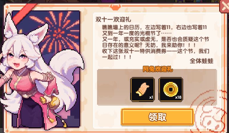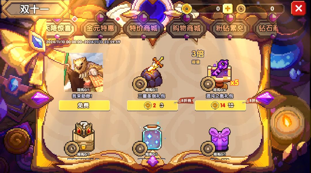 Tips: 本期双十一活动总共可免费领取金元x66,折扣券可用于双十一商城指定礼包