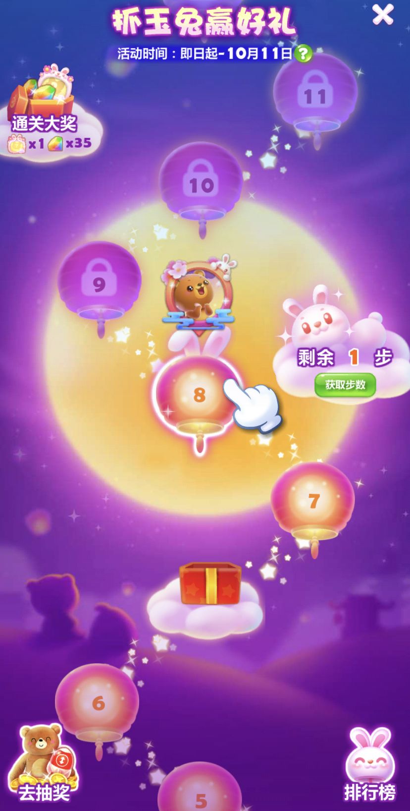 下至人间的月宫玉兔们因为迷路四处逃窜,为了帮助它们重回月宫,消消乐村小村民们开展了一场特别的抓玉兔活动~参与晒图就能100%获奖,闯过关卡越多奖励越丰富,快来看看吧!