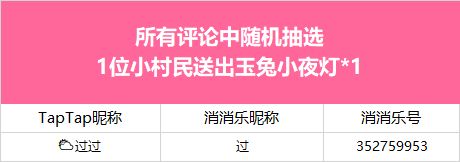 所有参与评论的小村民都将获得:初级精力瓶*5,银币*2000,并从中随机抽选1位小村民送出玉兔小夜灯*1