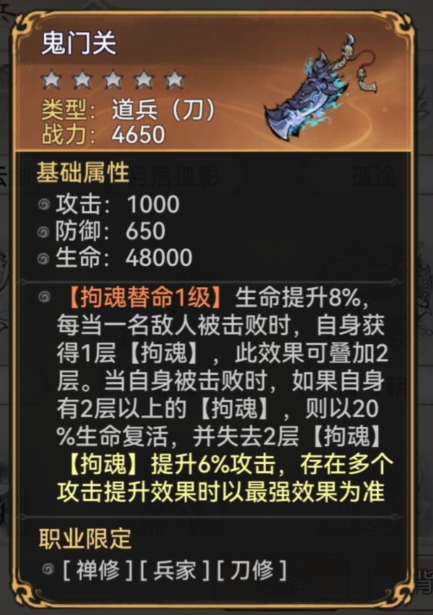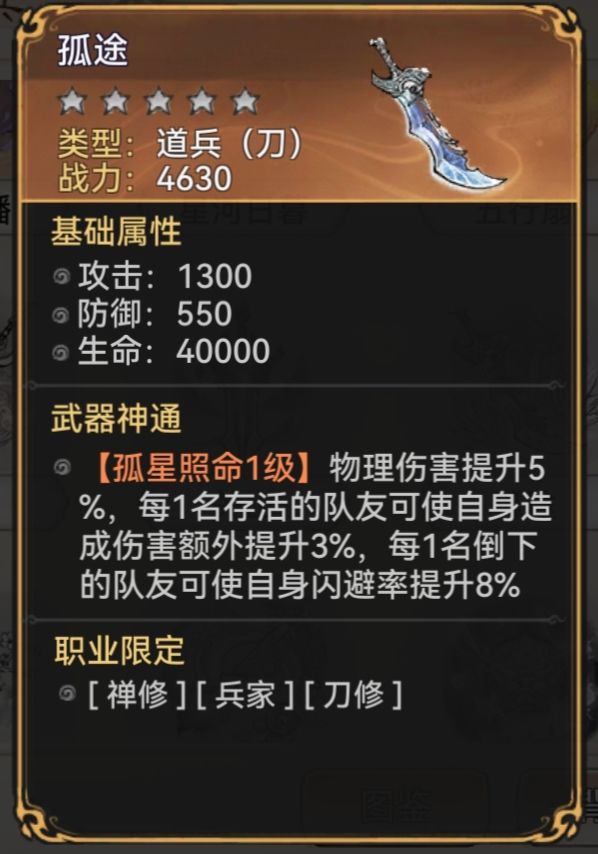 孤途是卫寒天命赠礼伴生道兵,天命达到红一后氪328获得。能够有效提升卫寒物理输出,每一名存活队友都能为卫寒提供额外的物理伤害加成,而倒下的队友则提供闪避率加成,完美适配卫寒属性。