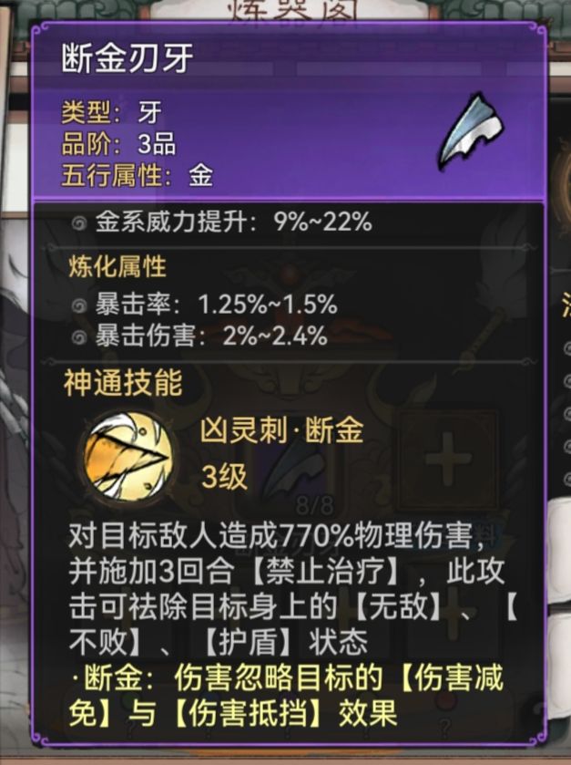 (3)3阶金牙(金系主法宝单体首选,缺点是蓄力值过高)