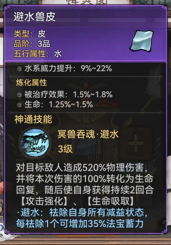 a.技能效果:对目标敌人造成高额物理伤害,并将本次伤害的100%转化为生命回复,随后使自身获得持续2个回合的攻击强化和生命吸取,另外三阶水皮自带驱散减益能力,每驱散1个减益可增加35%蓄力值;