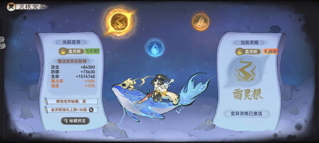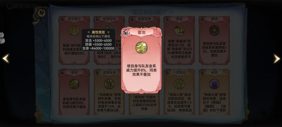 (3)秘藏选择:雷系变异密藏主推雷池,可以提高自身与队友金系功法威力。