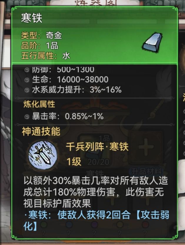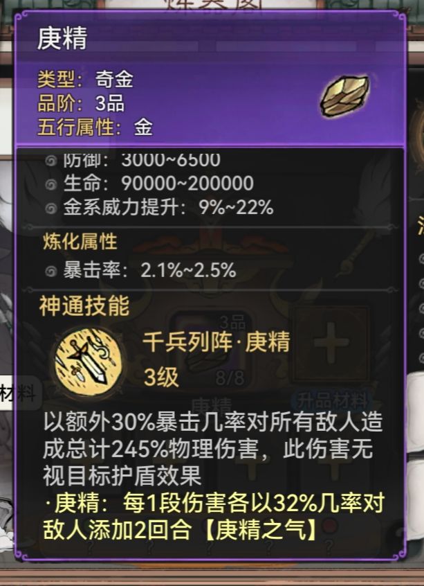 a.技能效果:以额外30%暴击几率对所有敌人造成物理伤害,无视护盾效果,并使敌人获得2回合庚金之气(受伤增加5%);