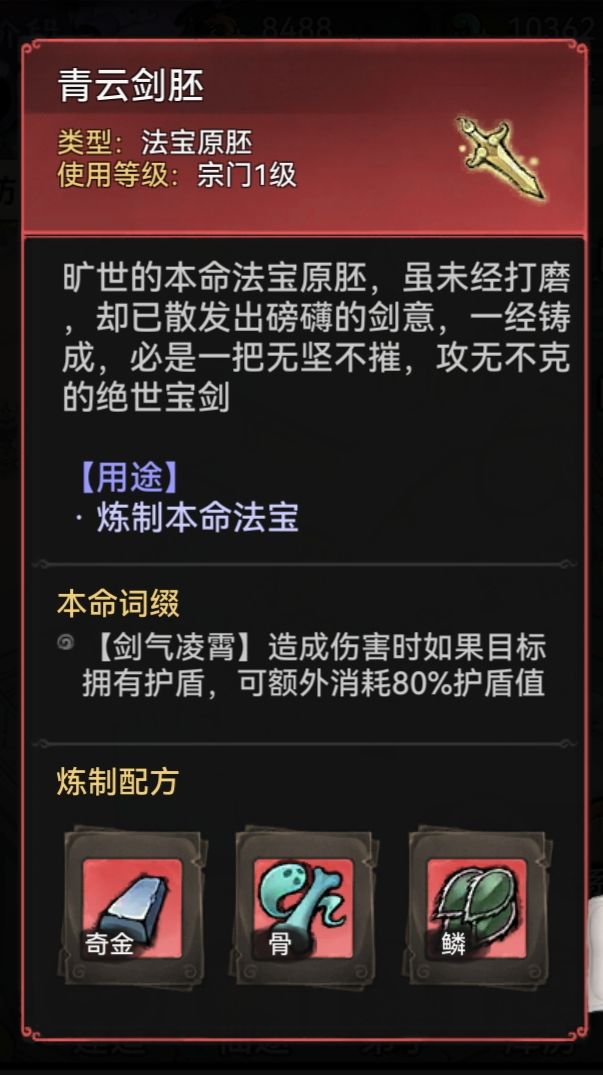 后天法宝为炼制本命法宝所需材料,一般情况下建议以三阶法宝作为主法宝,同属性法宝作为副法宝。