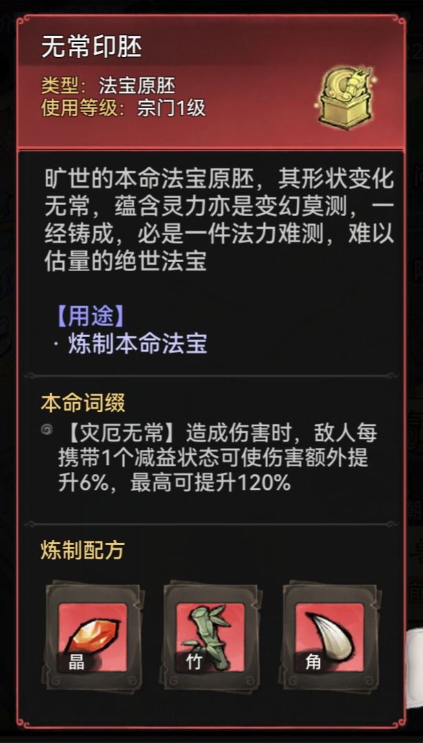 (1)词缀分析:当敌方携带减益状态时,使用无常印胚炼制出的本命法宝可根据敌人身上减益状态的数量提升伤害,减益状态越多,伤害提升越高。