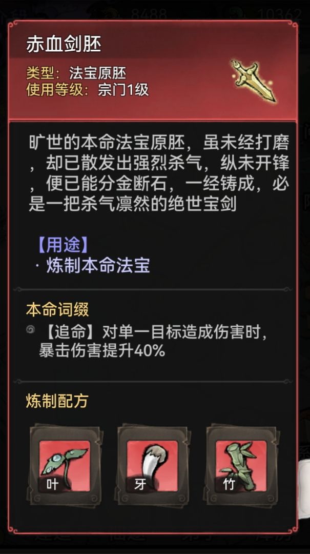 (1)词缀分析:对于单体打肉的天一卫寒流派来说,赤血剑胚是比较合适的本命法宝。它的暴击伤害提升,能够极大提升卫寒收割残血的能力。并且,法宝炼化时选择物伤或暴击属性,都能进一步提高赤血剑胚的伤害输出。
