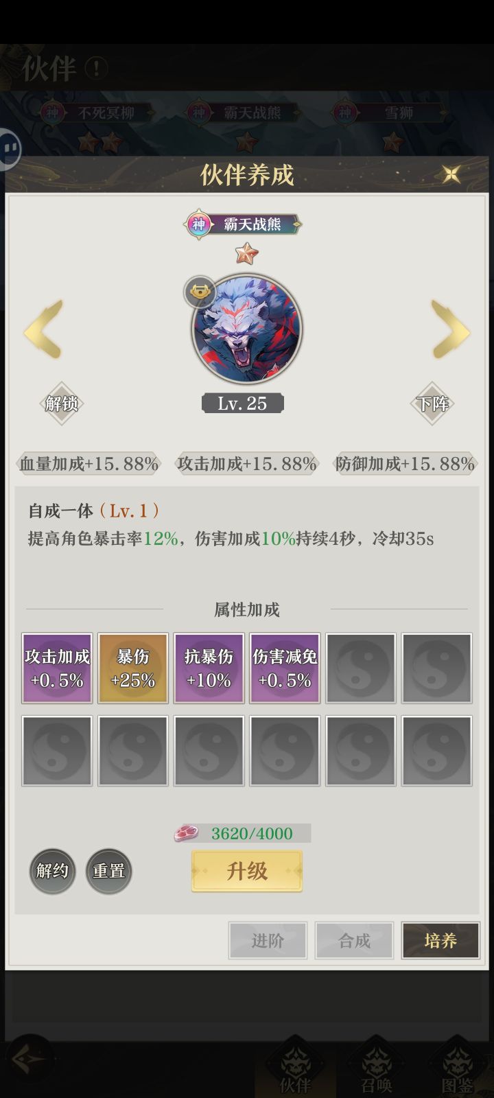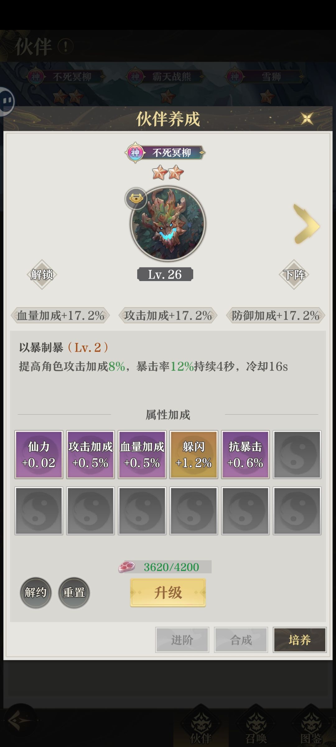 伙伴只推荐仙品和神品,圣品及以下只可用来过度,不建议培养。仙品:狐狸,冥柳,战熊,金乌。神品:狐狸,冥柳,战熊,狮子,金乌。其中狐狸和金乌对推图的帮助极大,冥柳、战熊、狮子会提高角色伤害,有助于玩家在宗门秘境和异兽入侵里拿到更多奖励。