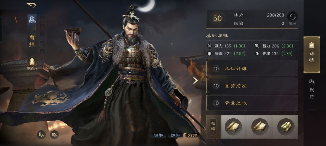 曹操战法:乱世奸雄+蓄势待发+青囊急救。