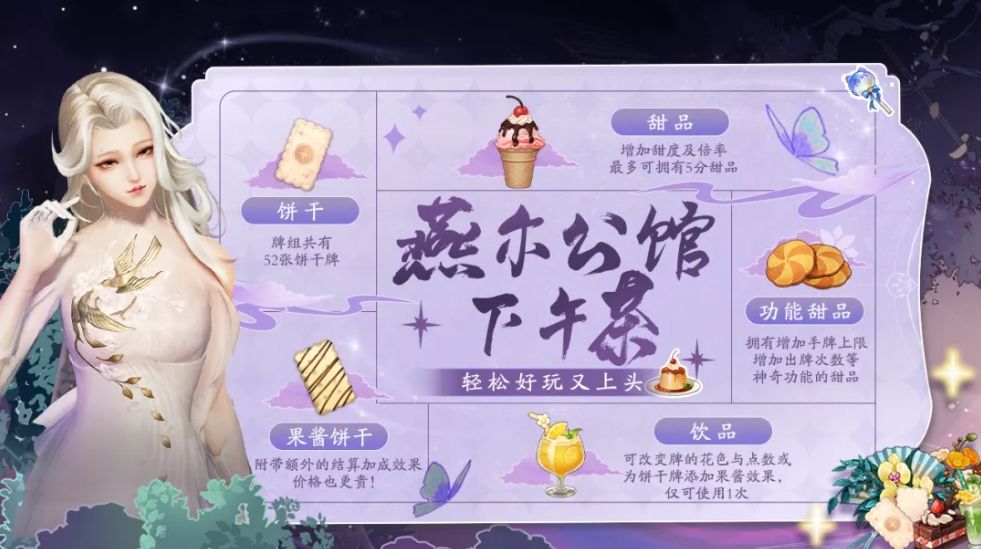 欢迎少侠来到由刀刀浮光乐园经理人燕尔尔经营的“燕尔公馆”!在这里少侠可以放下压力,在甜点和饮品的香气中玩一把快速上手又上头的燕尔牌,轻松愉快地度过悠然下午茶时光的同时,还可以挑战更高排行并获取闲情令奖励。#刀妃的冷宫重生日记