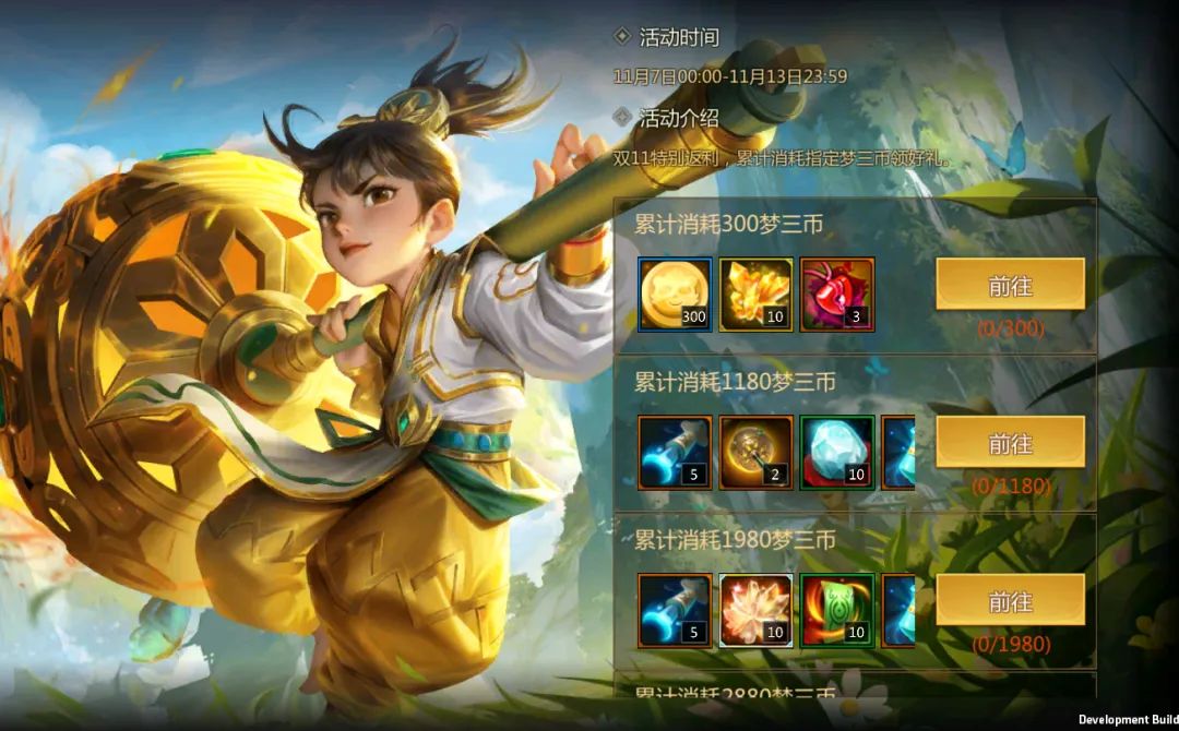 ▼【累计】消耗300梦三币可获得绑定梦三币*300、金色精炼石*10、橙色幸运符*3