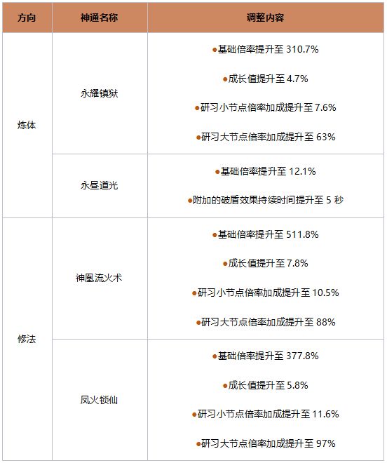 优化了神通帮助说明页面的汲元、激荡等效果描述;调整了部分神通的数值及效果,具体可见下表: