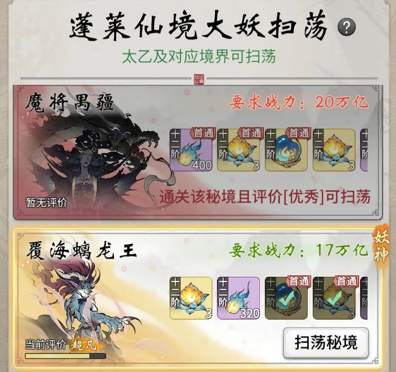 ●对应副本的通关评价达到“优秀”,且当周通关成功1次万妖宝境,即可开启扫荡功能