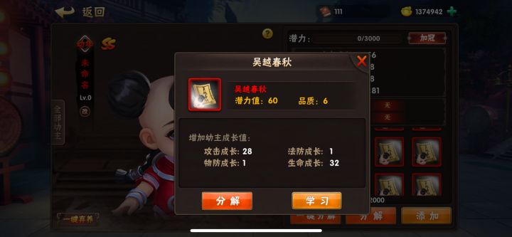 宝宝在出征前需要加冠,加冠前需要添加成长值和技能书。
