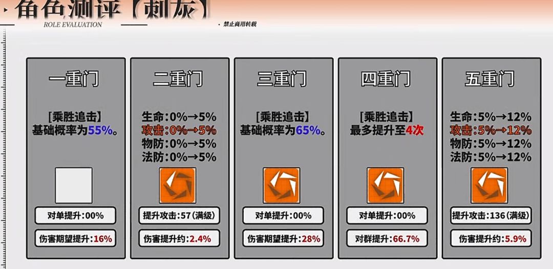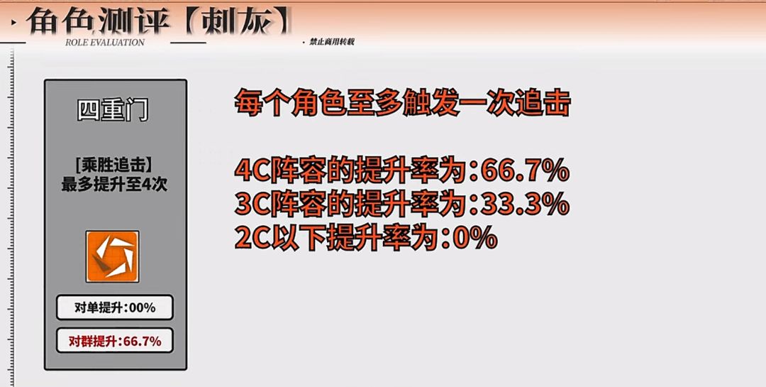 这个天赋技能就是刺灰打输出的最大依仗,不过这个效果个人回合至多触发一次,整个序列最多触发两次追击,每次释放后,都会使得超限技的伤害提升3%,和超显性的伤害提升3%,最多提升15%,值得注意的是,追击是每个单位独立进行判定的,因此,虽然单次追击概率为40%但实际上,当群攻造成击杀时,是会进行多次判定的。