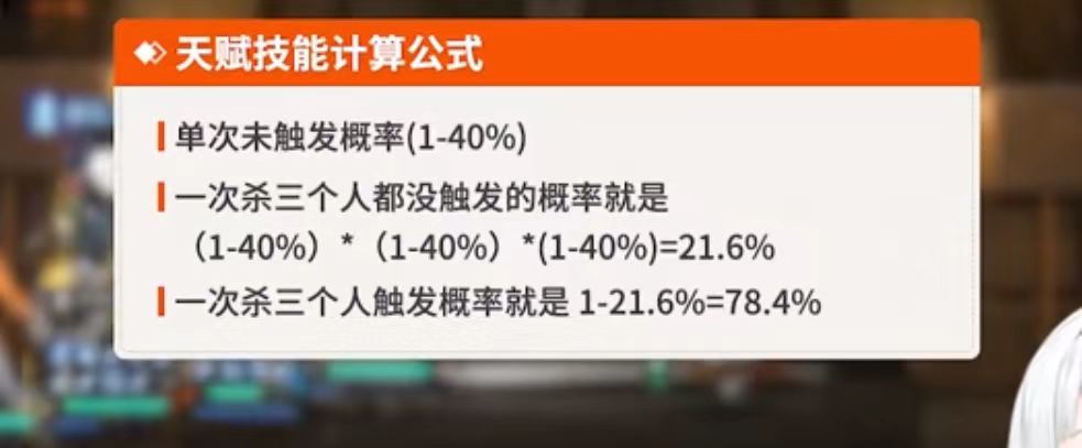 这三次中,只要有一次判定成功,就能切仅触发一次追击,所以在实战中,这个概率要比技能描述的概率高,具体计算公式与概率如图所示: