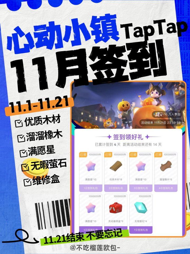 11月Tap签到可得满愿星*30、优质木材、溜溜橡木、维修盒和无暇萤石,活动11.21结束~