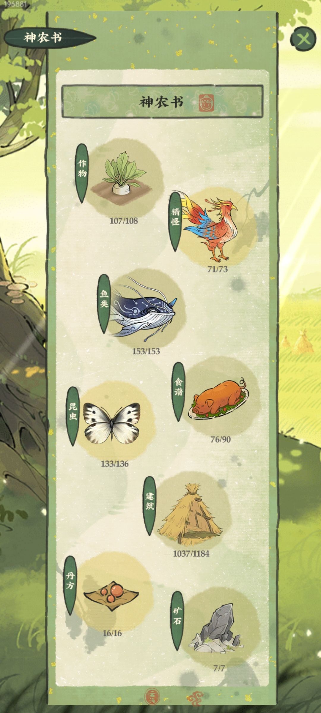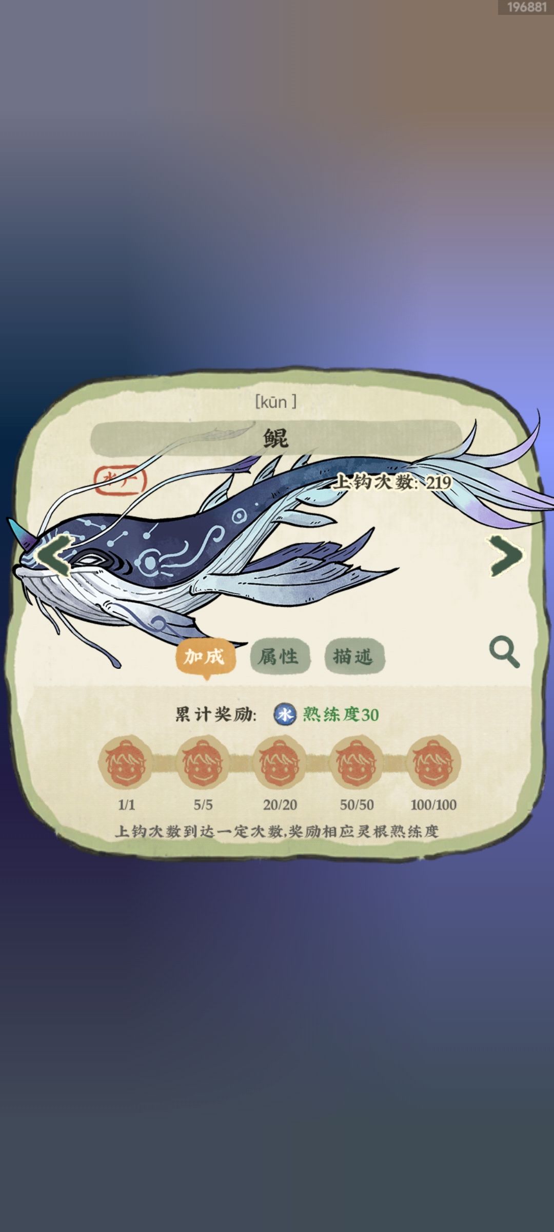 🍎神农书:不管是萌新还是老油条,经常翻看的功能,俗称“图鉴”,其中比较重要的是平时灵根熟练度的查看,绝大多数图鉴随着获取次数的增加,都会获得如图五所示下方写的那样子,水系熟练度+20,在下方写的次数,次数满后不在获得熟练度,图五翻译一下,意思是,鱼类-鲲-抓了二百多次-已经满了熟练度了-给了20水系灵根熟练度,熟练度有什么用,看下面。