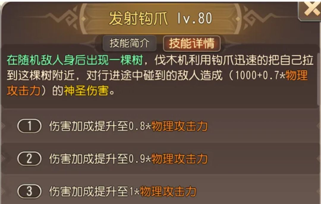 二技能——发射钩爪,切入型技能,目标随机有不可控性。自身位移,在位移的过程中造成神圣伤害。虽说数值不高,但是强在神圣伤害无视双抗。切入敌方阵容也能为其他队友分摊伤害。
