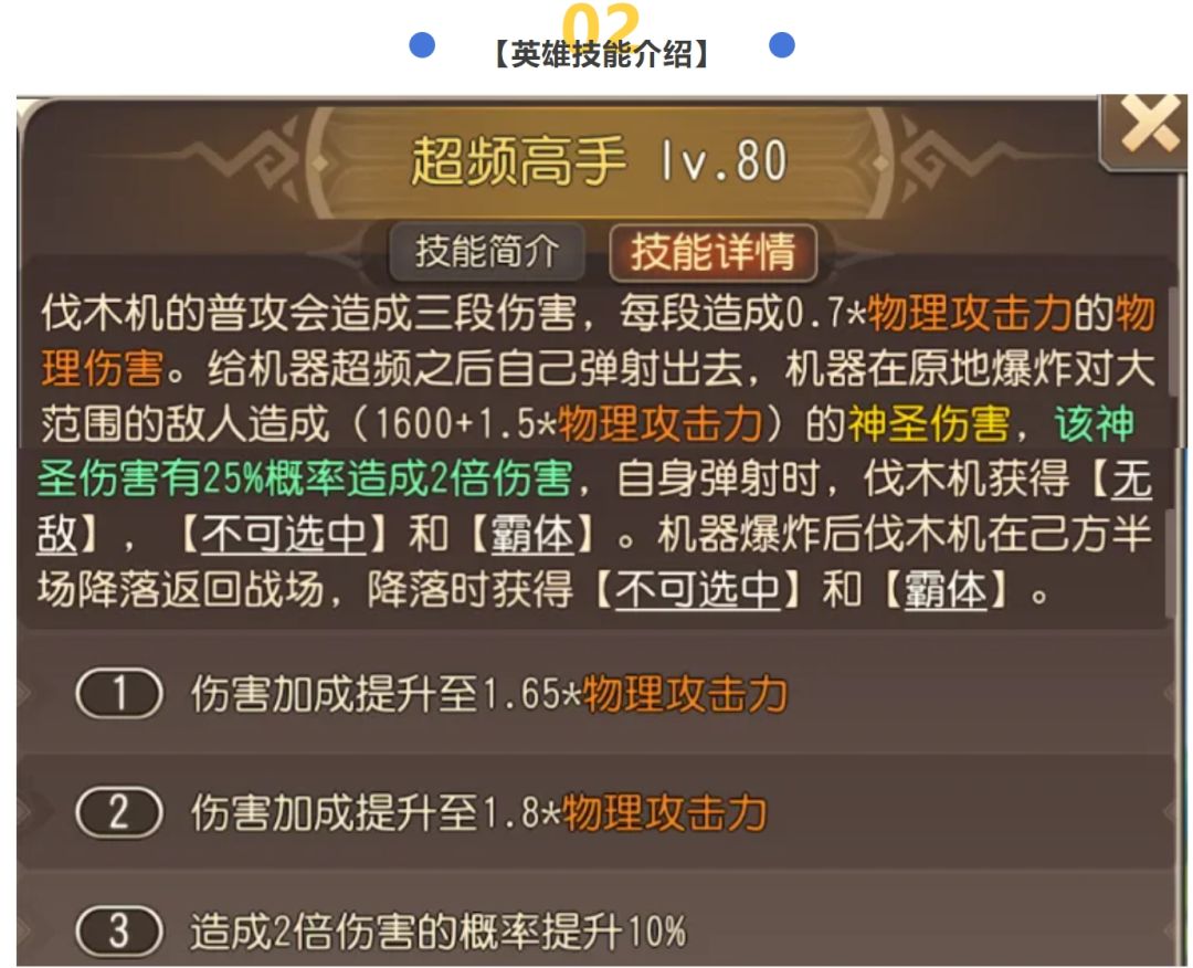 伐木机的大招——超频高手,大范围AOE神圣伤害,伐木机的主要伤害来源,造成伤害后会在己方半场降落,回到安全位置。需要注意的是,该技能的神圣伤害有1/4概率造成2倍伤害。神圣伤害无视双抗的特性,在面对较肉的敌人时有着不错的效果。