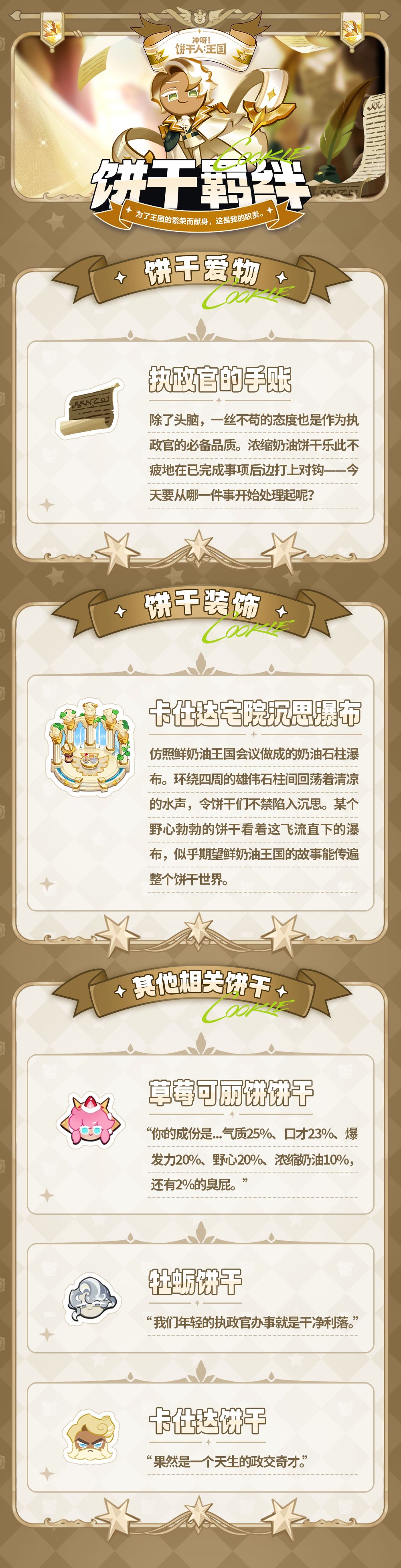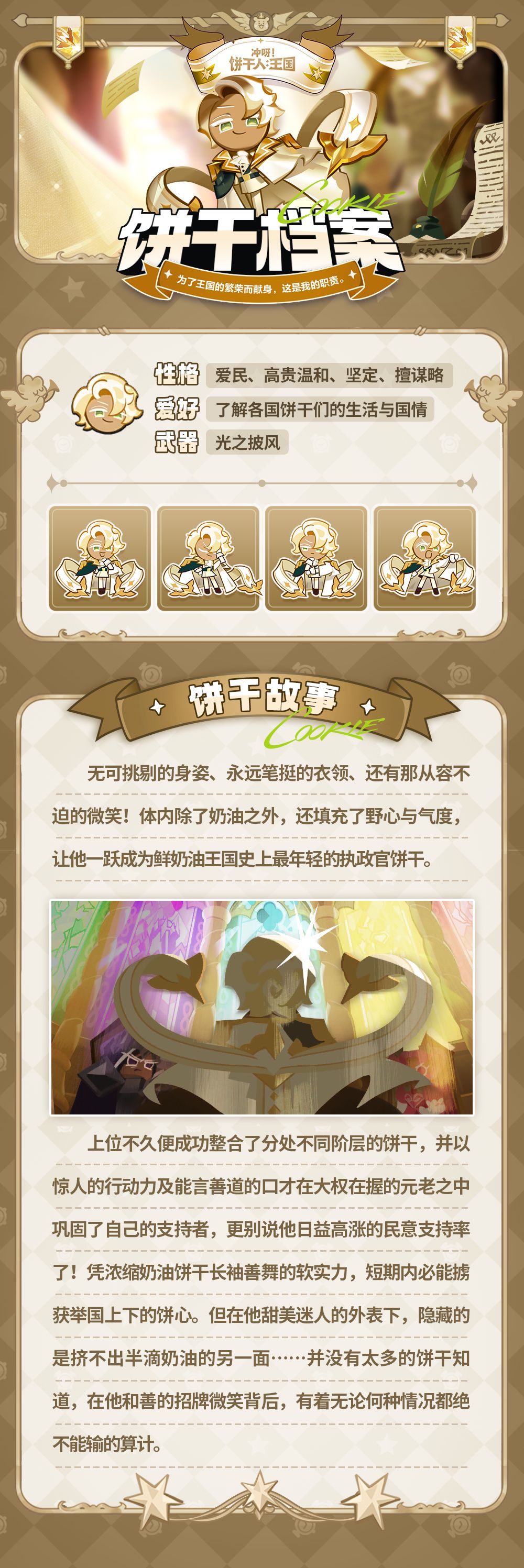 无可挑剔的身姿、永远笔挺的衣领、还有那从容不迫的微笑!体内除了奶油之外,还填充了野心与气度,让他一跃成为鲜奶油王国史上最年轻的执政官饼干。但在他甜美迷人的外表下,隐藏的是挤不出半滴奶油的另一面……