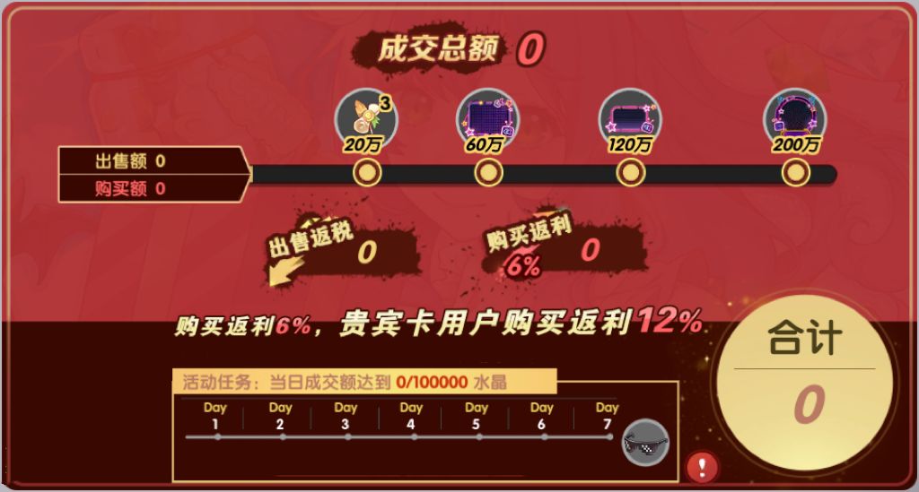 累计交易总额达到一定档位时,即可获得委托令、闪耀霓虹好友栏、闪耀霓虹聊天框、闪耀霓虹头像框等奖励;