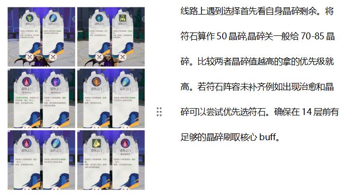 若没碰到核心buff谁品阶高就拿谁,其次是保命和攻击力。品阶高的buff为后续第14层刷取核心buff做铺垫。