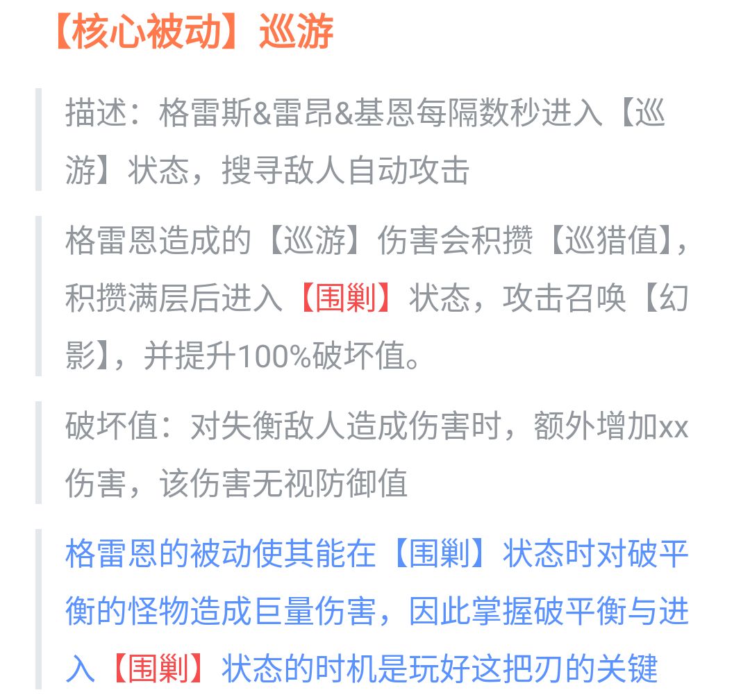 造成巡游伤害会积攒巡猎值,巡猎值100进入围剿(狂暴)状态,围剿状态格雷恩会召唤幻影并且破坏值翻倍(tips:破坏值翻倍效果即使切刃依旧存在)